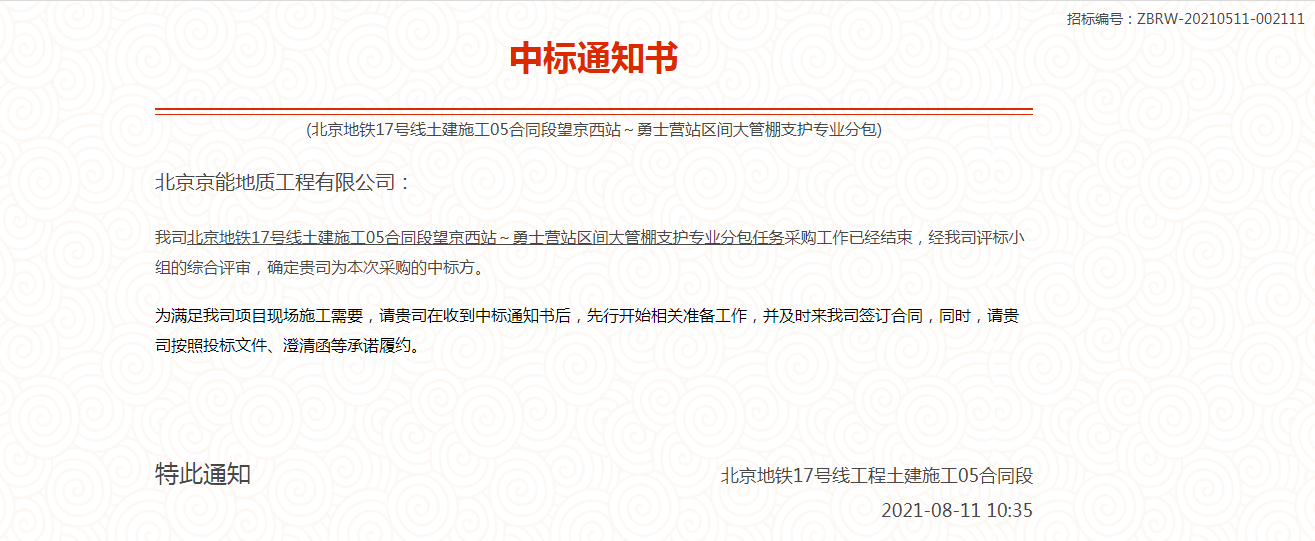 近日,北京京能地質工程有限公司成功中標“北京地鐵 17 號線土建施工 05 合同段望京西站——勇士營站區間大管棚支護”項目。