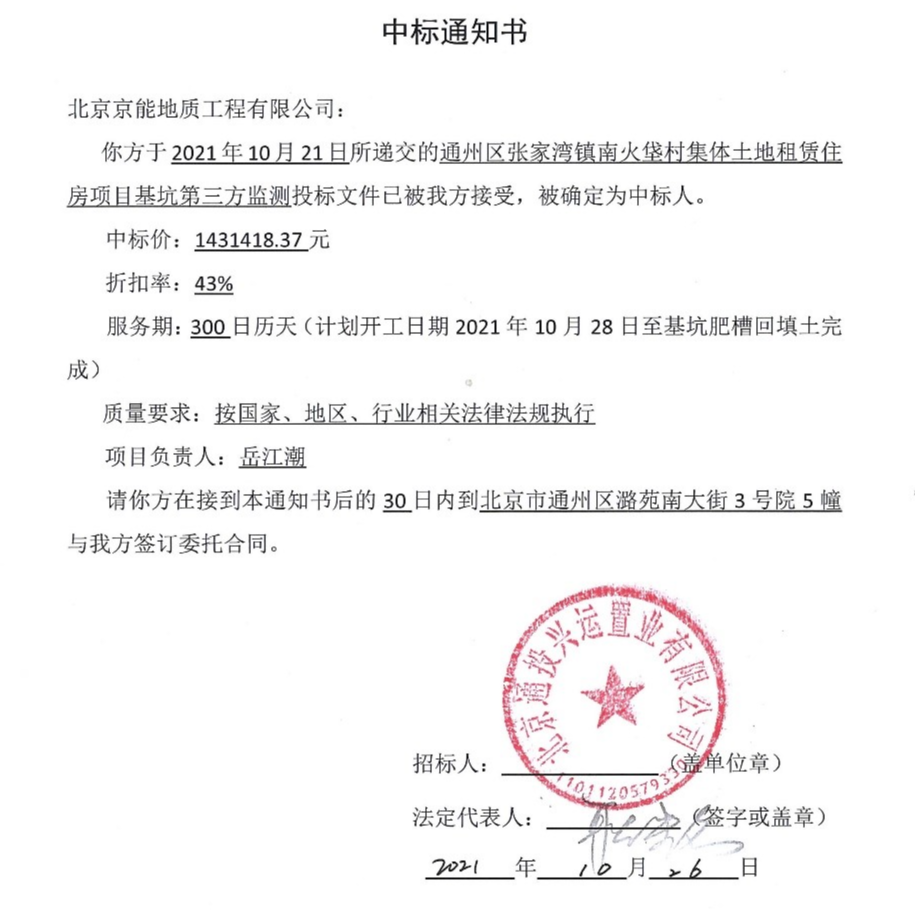 近日,北京京能地質工程有限公司成功中標“通州區張家灣鎮南火垡村集體土地租賃住房項目基坑第三方監測項目”,中標金額1431418.37元。