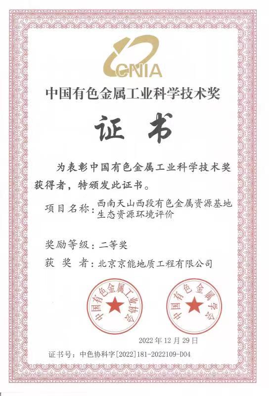京能地質工程有限公司同中色華宇(北京)生態科技有限公司和有色金屬礦產地質調查中心共同研究的“西南天山西段有色金屬資源基地生態環境評價項目”喜獲2022年度中國有色金屬工業科學技術二等獎。     該項目經過2015年至2019年四年的研究,先后實施取得了4個綜合研究和勘查項目系列成果: