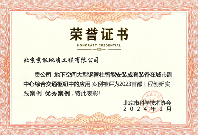 近日,北京市科學技術協會揭曉了2023年《首都工程創新實踐案例》的佳作,京能地質憑借其在城市副中心綜合交通樞紐中實施的“地下空間大型鋼管柱智能安裝”案例,榮膺優秀案例。