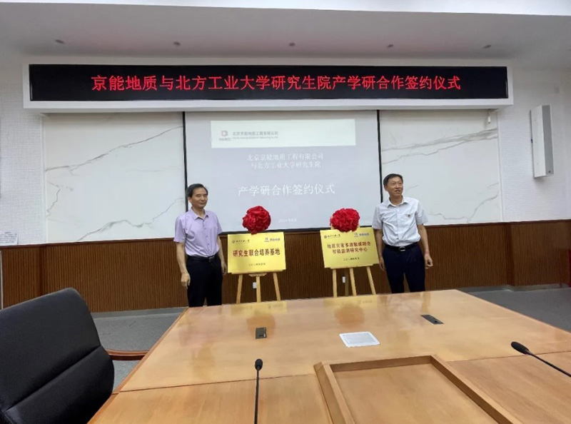 簽約儀式在京能地質公司隆重舉行,京能建設黨委書記張學東與北方工業大學副校長王健穩出席簽約儀式并致辭,在張學東書記與王健穩校長的見證下,京能地質與北方工業大學研究生院正式簽約并揭牌成立研究生聯合培養基地及地質災害多源數據融合智能監測研究中心。
